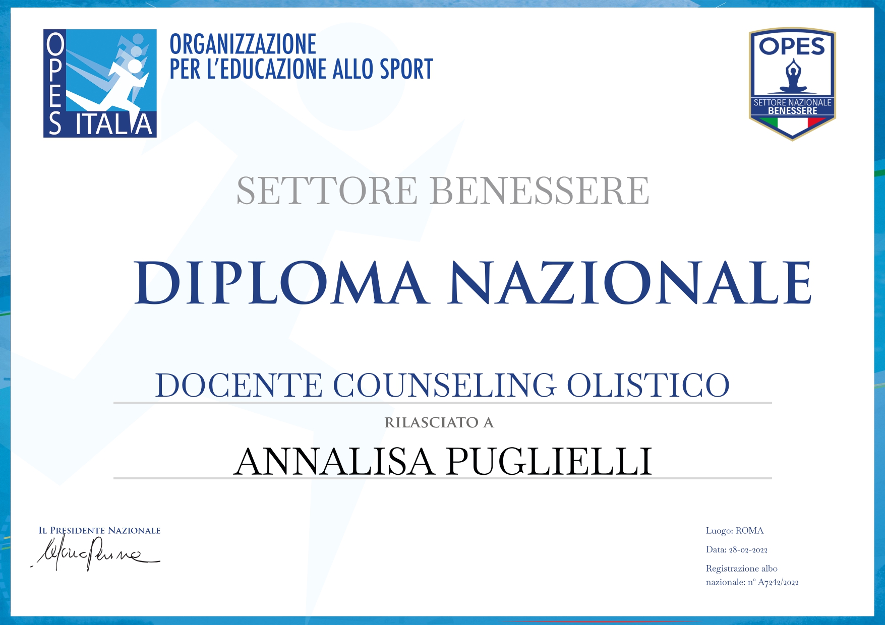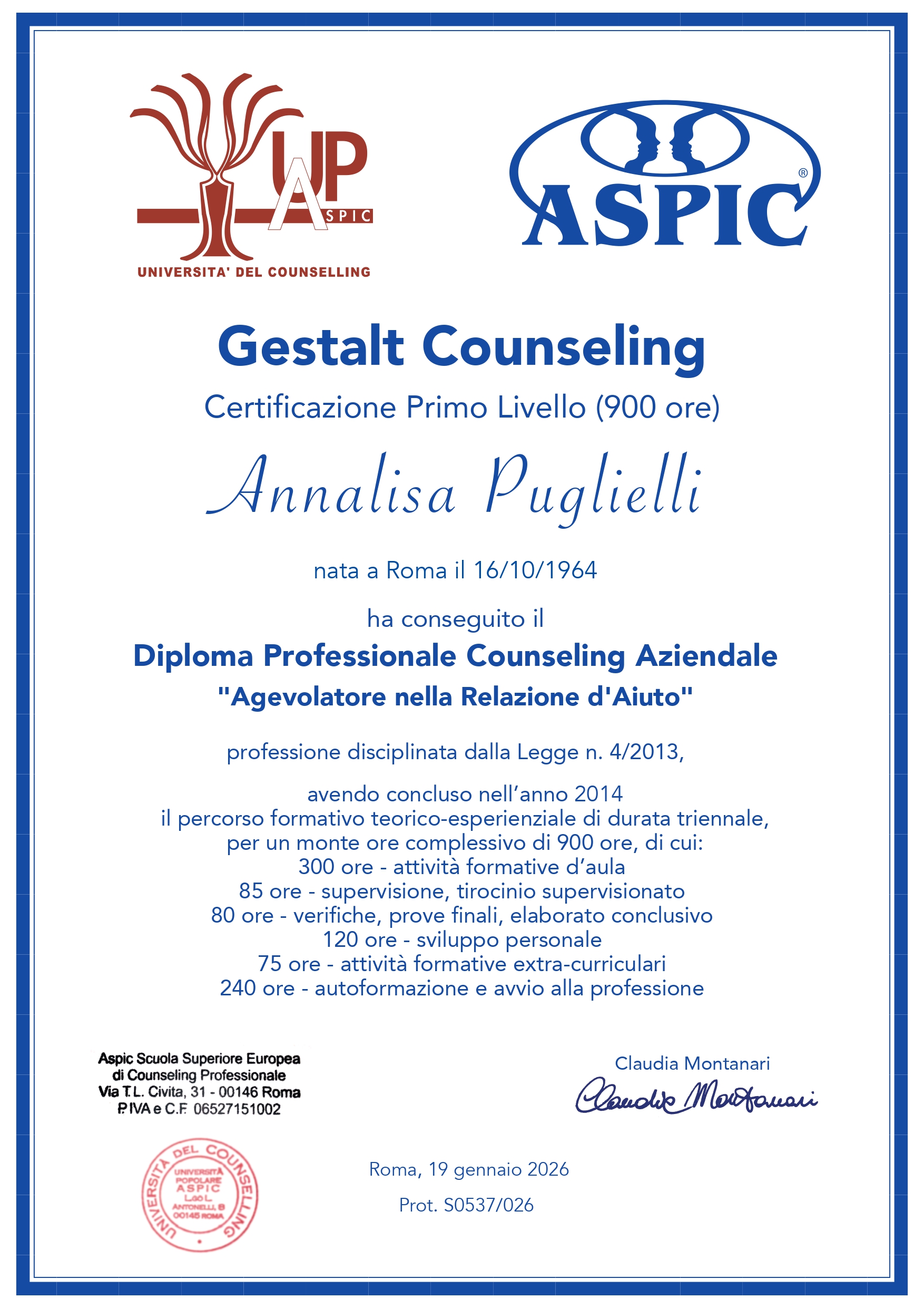 Ho intrapreso nel 2009 il percorso di Counseling Aziendale, con Master triennale, a seguito di un momento molto difficile sul lavoro. Dal 2014 lavoro come Counselor Professionista impegnandomi in formazione continua e aggiornamento professionale. Nel 2023 mi sono certificata Coach Relazionale integrando così strumenti di Coaching nella metodologia del Counseling.